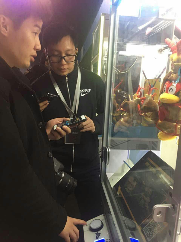 趣抓™系列娃娃机,是“互联网+“运营模式的产物。从扫码参与游戏、领取电子优惠卡券、微信支付、游戏过程,甚至售后运营、广告大屏营销全过程,数娱科技的工作人员向参观者详细介绍了趣抓™如何将微信接入传统娃娃机并实现线上线下全面贯通的经营模式。